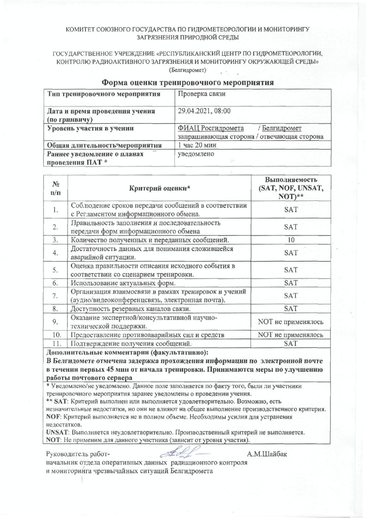 Руководителями работ отмечено, что все учения в первом полугодии 2021 года прошли на высоком уровне и показали слаженность действий сотрудников ФИАЦ Росгидромета и Белгидромета.